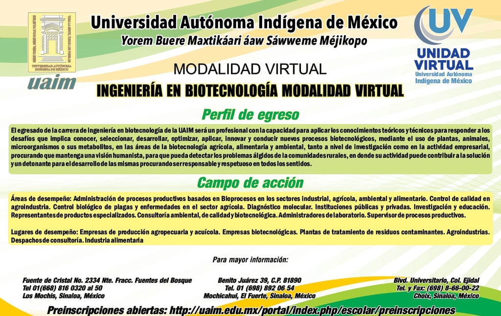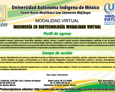 © 2026 Universidad Autónoma Indígena de México (UAIM). Portal informativo del Programa Educativo de Ingeniería en Biotecnología – Modalidad Virtual.