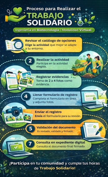 El Trabajo Solidario es una actividad formativa obligatoria del plan de estudios que tiene como propósito fortalecer la formación integral del estudiante mediante la participación en actividades de beneficio comunitario, permitiendo aplicar conocimientos adquiridos durante su formación académica y desarrollar valores sociales, éticos y humanistas.
